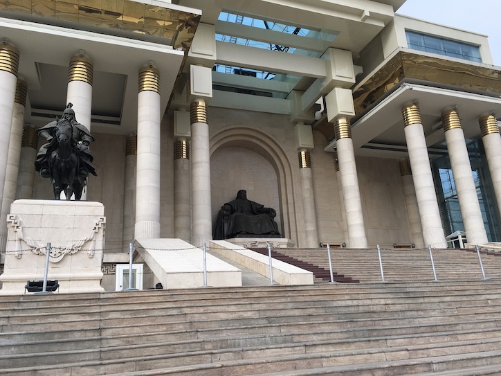 Sukhbaatar Square, the main square in Ulaanbaatar named after the famous patriot. The Parliament house, stock exchange, Opera and Ballet theatre as well as cultural palace are located in the surroundings of the square.